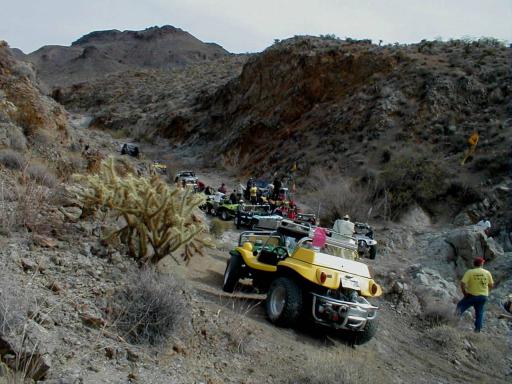 | We camped on the Colorado river just north of Bullhead City. Local buggy builder Marc Frederick (member #900 above) was kind enough to be our guide again this year. We split into three groups to enjoy either the "difficult", "medium", or the "Posey Sniffer" trails. Marc led the "difficult" capability group out on the trial the first day for some hill climbing, rock climbing, and then lunch in Oatman. |