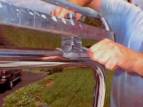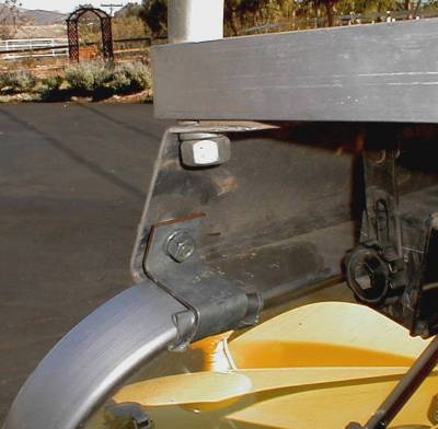 The attachment hardware is made from steel. The aluminum support rail is kept in the windshield groove by two small brackets. The brackets are made from 1/8" thick steel strap that is 1-1/4" wide by 3-1/4" long. The ends of the bracket are bent in opposite directions. One end (1" inch long) is bent up 90 degrees and a hole is drilled in the center to bolt to the front support rail. The other end (3/4" long) is bent down 90 degrees so that it will fit behind the windshield frame. When bolted in place, the bracket does not support any weight but will keep the support rail from coming out of the windshield frame groove. One bracket is bolted on each side of the support rail with a 5/16" inch bolt.