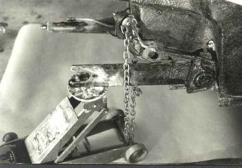 Be aware that there is still great tension on the swing plates. There is a lip in the shock tower casting that keeps the swing plate from dropping down. The axle keeps the swing plate from moving out past the lip, but with the axle removed the swing plate can slip past the lip and come crashing down. Place your hydraulic floor jack under the end of the swing plate. Now loop the chain under the axle of the floor jack and up over the shock mount. Bolt the ends of the chain together and bolt the chain to the shock mount hole. This lash-up is absolutely necessary to control the tension on the swing plate. Without the chain, jacking the swing plate will lift the entire car and not change the position of the swing plate. It is not safe to proceed without the jack and chain in place.