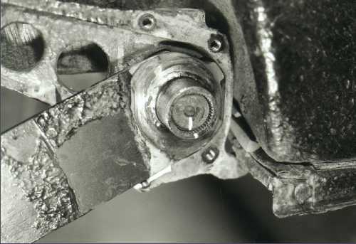 As the swing plate is lowered, its own tension will force it out off the torsion bar and over the lip in the shock mount casting. This must be done slowly in small increments. Each time you lower the jack a little, use a hammer to hit the end of the torsion bar. This will keep the torsion bar in the car and allow the swing plate to slide off the outer splines. When the swing plate is out past the lip in the casting, jack it up and remove the screw driver. Then lower the swing plate all the way down until it is no longer supported by the jack. Now use the Dremel tool to grind a tiny groove in the cast iron shock mount just below the bottom edge of the swing plate. This is necessary to document the position of the stock torsion setting in case we screw up and need a reference point to start over.