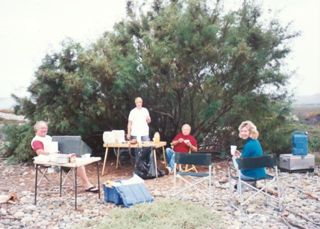 We had the beach completely to ourselves. We made a fire with wood taken from the forest on the mountain top. The Meyers discovered that their roof-top water bottles leaked during the day's the trip...wet bedding! Luckily the Boy Scouts (Bruce L. and Dave) carry spare everything...including sleeping bags! We BBQ'ed steaks for dinner.