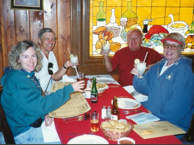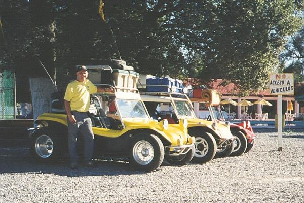 Just after noon we were at the Mexican border at Tecate. We filled up our cars and gas cans with fuel on the US side. First stop after crossing into Mexico was for lunch in town. Bruce Lightner forgot his tellow Y.B.D.B. T-shirt, so Dave loaned him a spare...we were mistaken for some kind of "gringo gang" during the trip, thanks to our matching "uniforms".