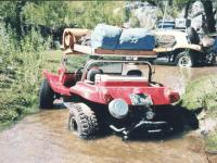 Bruce Lightner tried to cross the stream with Old Yell'r to tow Old Red out...guess what happened to his buggy? All ended happily as we had a hand winch, plenty of rope, and lots of trees. Dave towed Old Yell'r out and then we winched Old Red out.