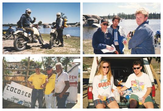 The first two photos are of a couple of bike riders (one a school teacher) from Santa Ana California we met on Day #1 over lunch at Laguna Hansen...a perfect day for off-roading They were scouting for an upcoming motorcycle event, and being out of beer, we provided them with a couple of brews...and a copy of our topographical maps of Baja. The third photo is of the multilingual fellow (Coco) who lives at Coco's Corner in a tiny trailer, and reportedly speaks seven languages. The last photo is of two U.C. San Diego undergraduates (Biology majors?) we met in a campground in the Bay of L.A. They were taking it easy between quarters. Unlike us, they were nice, quiet campers who went to bed early. We, on the other hand, had to celebrate someone's birthday...in the bar, so we didn't pitch our tents until well after dark!